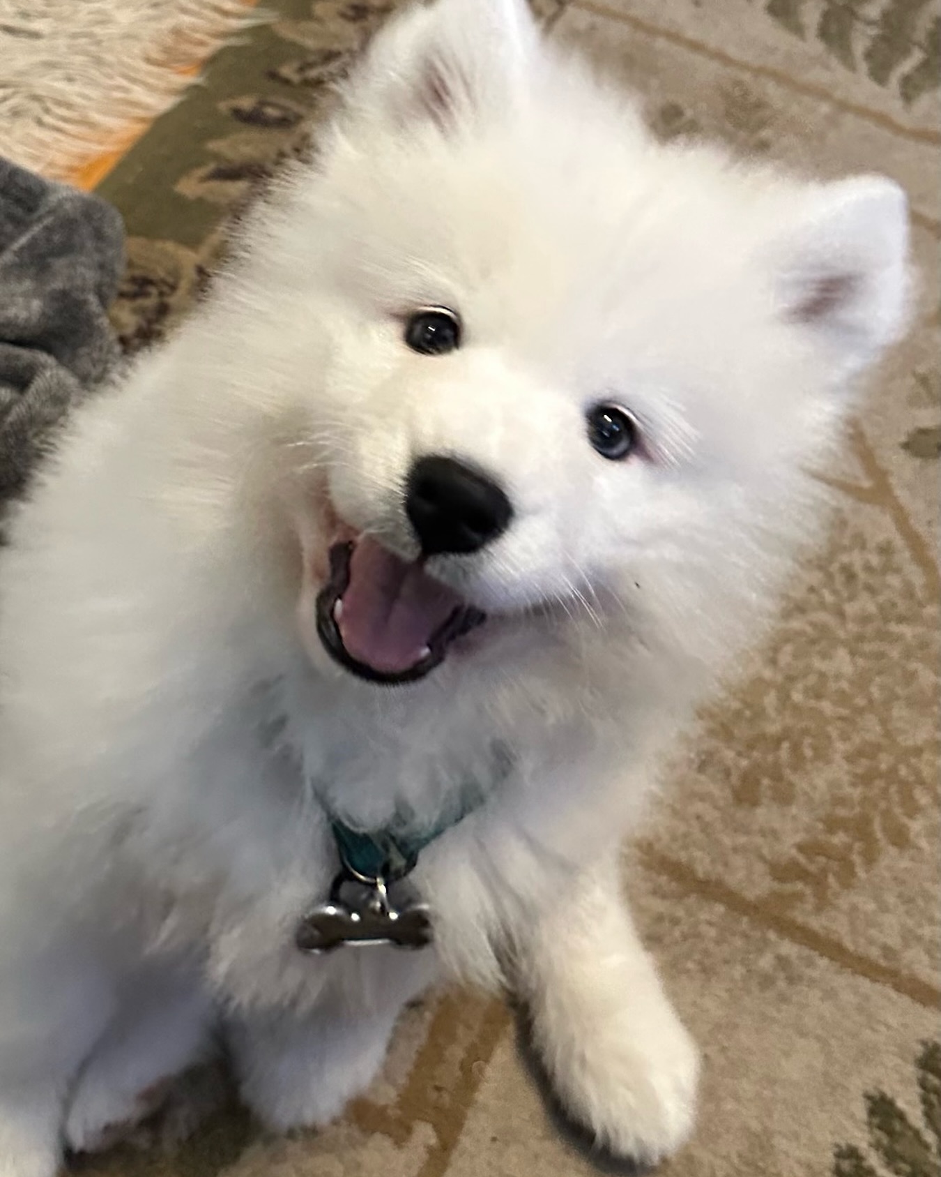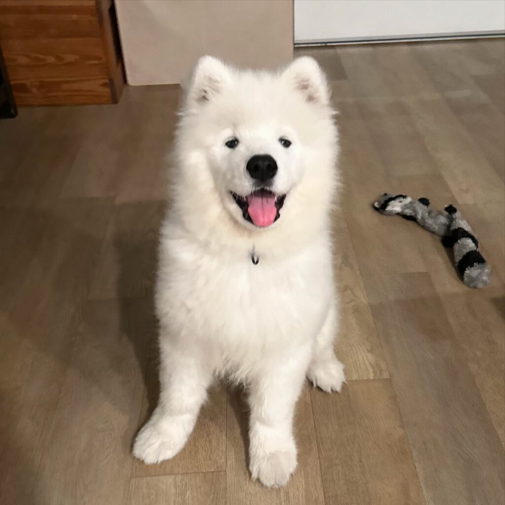 We begin potty training and crate training with our Samoyed puppies before they go to their new homes. While they won’t be fully trained, they’ll have a good foundation for you to continue their training.